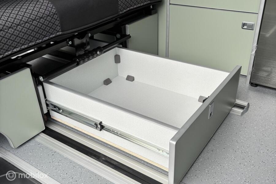 Het keukenblok bestaat uit een spoelbak met schoon- en vuilwatertank en een 2-pits gasstel en een besteklade. De Dometic compressorkoelkast met vriesvakje en koelvak heeft een inhoud van 45 liter en verschillende opbergvakjes.